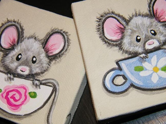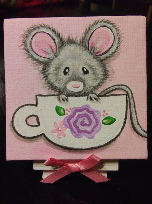 A Cupful of Cute, Lil Mouse mini artwork 3x3 Custom painted just for you, choose colors, flower, teacup art, mouse painting
