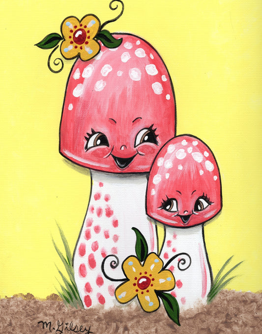 Cheerful Red n White polka dot Mushroom family ORIGINAL Painting 9"x12", acrylics