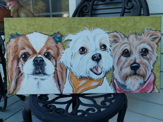 Custom Multiple Pet Portrait Painting 12x24 handpainted Pet Memorial, painted from photos of your pet, animal Art, personalized gift